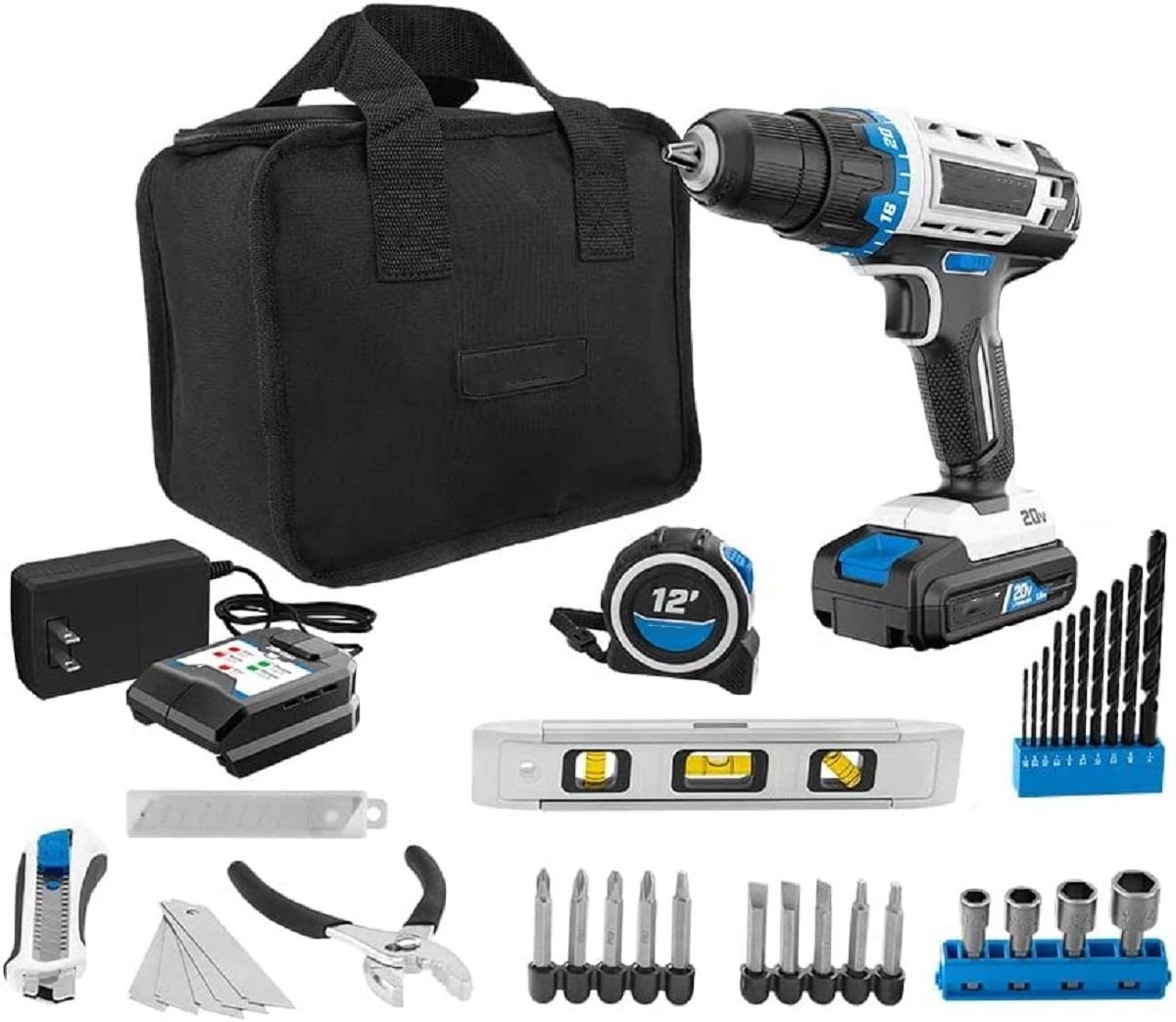 1.This project kit includes the 20V 3/8-inch Drill/Driver that features a 24-position clutch for adjusting torque while driving fasteners putting ultimate control in your hands. The included accessories are a 10 PC. Drill bit set, 10 PC. 2†driving bit set, slide knife, 5 knife replacement blades, slip joint pliers, 12 ft. tape measure, torpedo level, 4 PC. Nut driver set and a 10-inch storage bag.