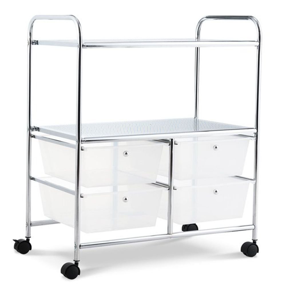 Stop worrying about your messy home! Let's help you keep your house tidy; the 3 tier storage cart has four drawers and two layers; it provide enough spaces to put stuff. Thus; your room will be tidier. Our cart are made of quality steel and pp; durable and sturdy. Shelves with mesh are breathable. It has two handles and four flexible wheels that you can grab and move better; at the same time; two of the wheels can stay stable when it's stationary. Our drawers are detachable. Not only can you put things of different heights; but also take it out for separate use. It can be used in the bathroom; living room; bedroom; balcony or office; and its instructions are simple; you can assemble easily.