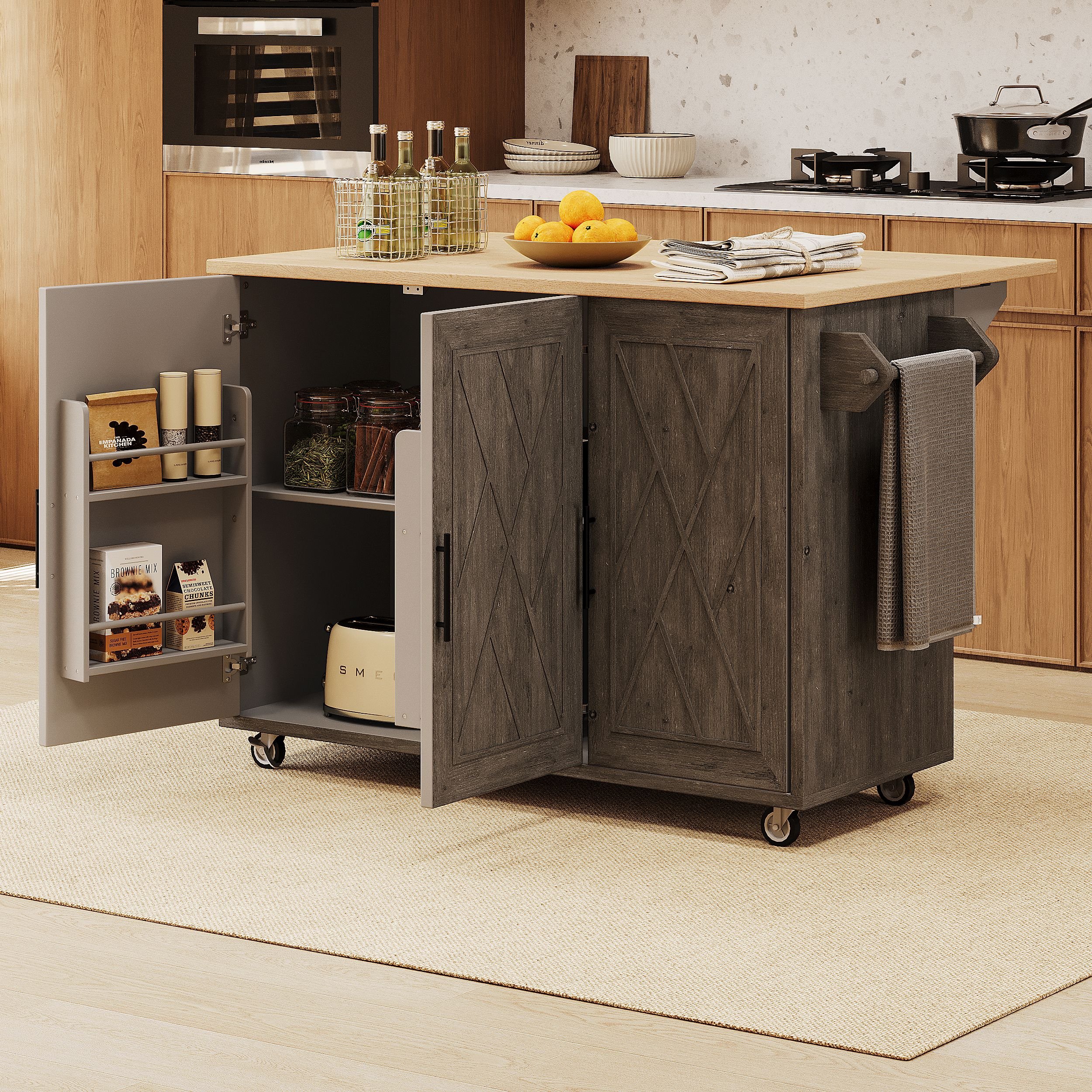 51.2"W Geometric Twill Stripe Textured Design Kitchen Island with Drop Leaf, Farmhouse Kitchen Island on Wheels with Internal Storage Rack