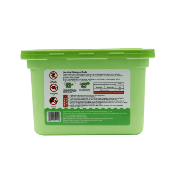 Space-saving: Powerful cleaning detergent liquid pods are packed in a container. Our powerful laundry capsules and leading detergents