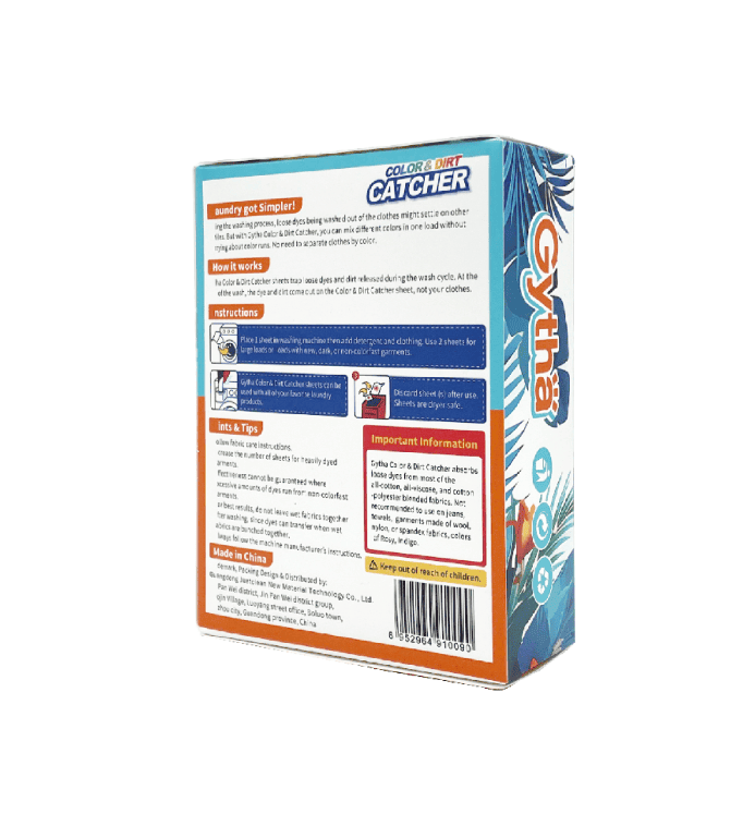 This product adopts nano-adsorption technology and is processed through special technology. It can timely and quickly absorb and lock the dyes and pigments freed in the water, so as to avoid the adhesion of these dyes to the clothes, prevent the dullness of the clothes caused by the string of colors, and help keep the clothes as bright as new. Solve the problem of mixed washing of clothes of different colors, and save water, time and electricity.