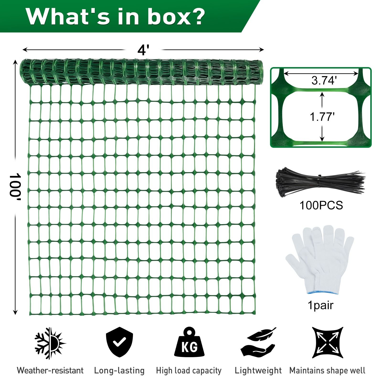 5.Combo Set - Comes with 1 roll mesh fencing roll size 4'X100' (1.2m X 30m ), 100 zippers and 1 pair of gloves. Any problems, please don't hesitate to contact us. We are happy to help you solve it.